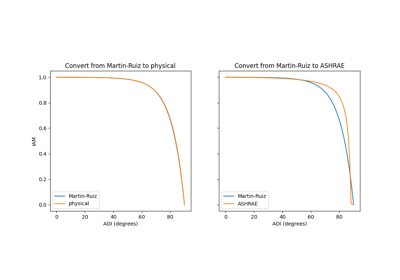 source_nameis'ashrae'andtarget_nameis'physical', if fix_n isTrue,iam.convert()will fixnso that the returned physical model has the same x-intercept as the inputted ASHRAE model. Fixingnlike this improves the fit of the conversion, but often returns unrealistic values for the parameters of the physical model. If more physically meaningful parameters are wanted, set fix_n to False.xtol (float, optional) – Passed to scipy.optimize.minimize.