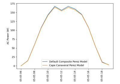 pvlib.spectrum.spectral_factor_firstsolar()to calculate the spectral loss modifier.get_ac(model, p_dc[, v_dc])Calculates AC power from p_dc using the inverter model indicated by model and self.inverter_parameters.
