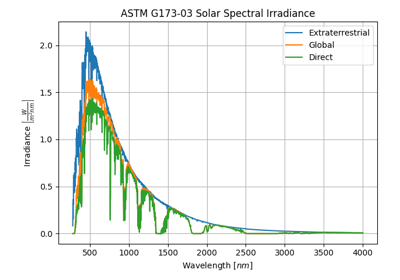 ASTM G173-03AM1.5 standard [1], which returnsextraterrestrial,globalanddirectspectrum on a 37-degree tilted surface, optionally interpolated to the specified wavelength(s).- Parameters: